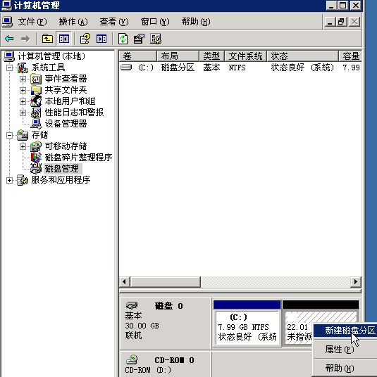 左边导航栏选择磁盘管理,然后在右边的磁盘列表里,选中“未指派”的硬盘区域单击右键